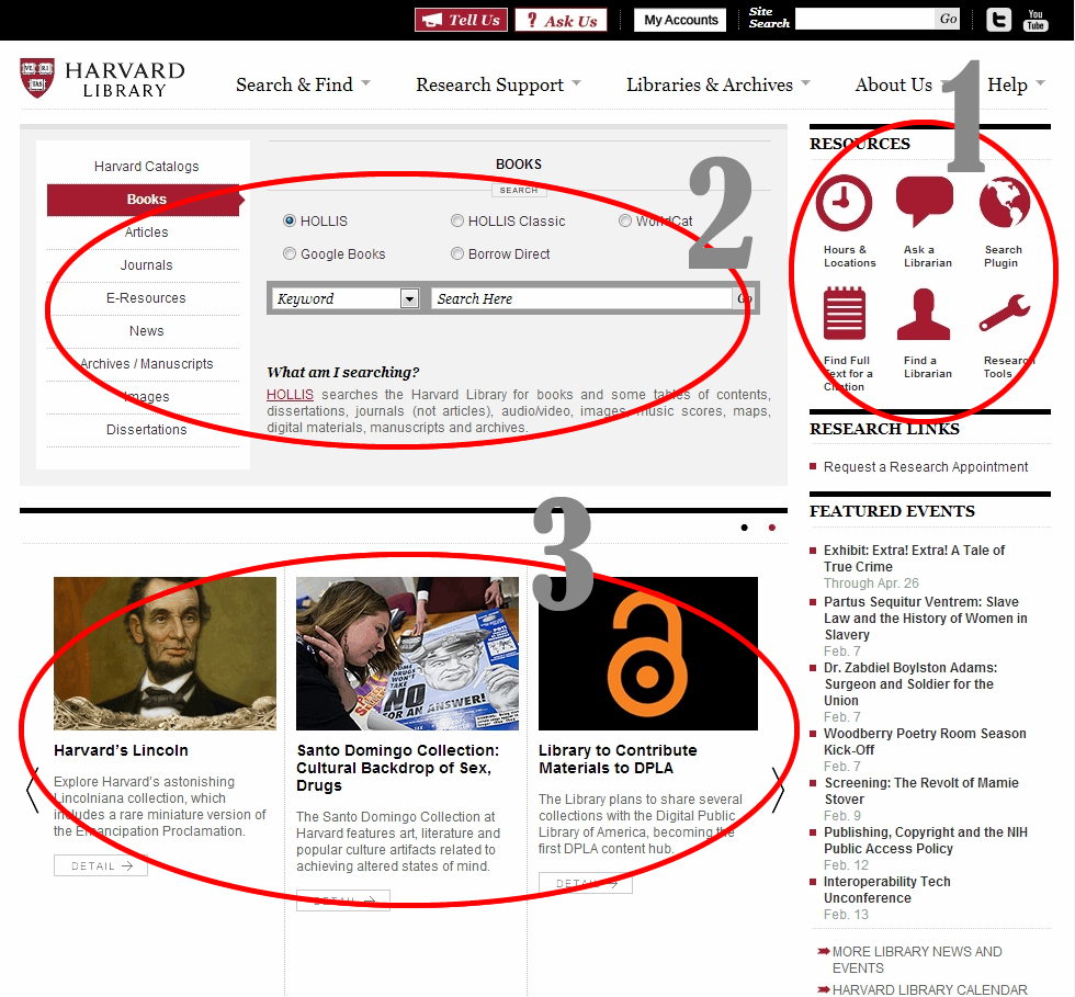 I took a look at the Harvard Library website over the weekend, to pick apart the elements of the site that I really like. First and foremost, I love the minimalist layout and color scheme. The white background makes it look less boxy, and the sections are separated by horizontal lines instead of rectangular borders. I know library websites are chock full of content that we want our users to be aware of, but when there’s too much content on a page, I find I can’t focus on anything.